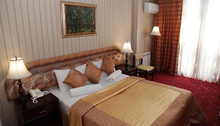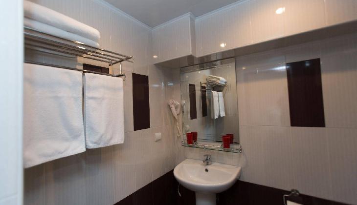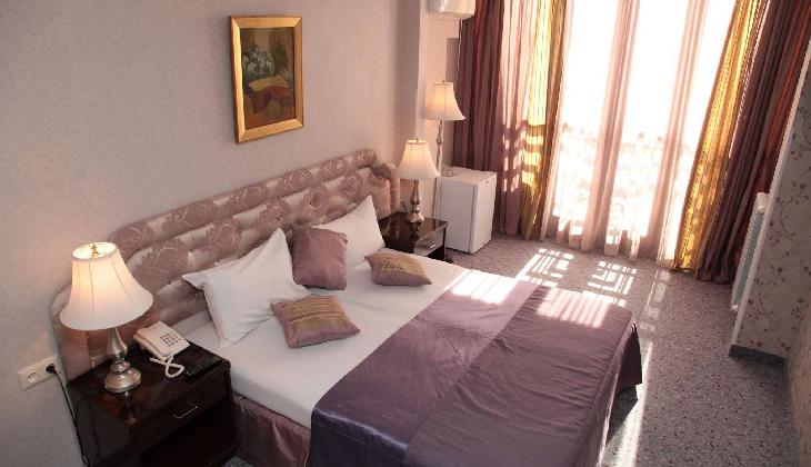 Shirak is a traditional 3-star hotel offering comfortable accommodation and high quality facilities, in the heart of the city. Highlights include two eateries, free Wi-Fi and excellent transport links. The hotel is ideally located in the centre of the city, opposite Kirov park and just a short walk from Republic Square, famed for its attractive singing fountains. There are numerous attractions close by, including the National Gallery of Armenia art museum, the Opera House and the Vernisage arts and crafts market. Hanrapetutyun metro station is in the vicinity, offering quick and easy access to destinations throughout the city. The hotel is housed in a 14-storey building, dating back to 1978. Facilities include a garden terrace and a sauna. Free Wi-Fi is also available throughout the premises. The canteen of the second floor of the hotel offers traditional Armenian dishes. On the first floor of the hotel there is also a cafe offering a range of Armenian meals and snacks and a bar which boasts live music during the evenings. Meals and drinks can also be enjoyed on the furnished terrace. Standard rooms have a classic decor, complemented by warm colours. Each room has a balcony and some include views of the city and/or Mount Ararat. Amenities include a satellite TV, mini-bar and a telephone. Rooms with chargeable air-conditioning can be requested. The tiled bathrooms feature a bathtub with integrated shower. Free parking is possible onsite.