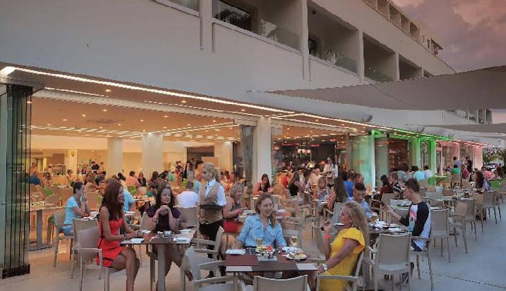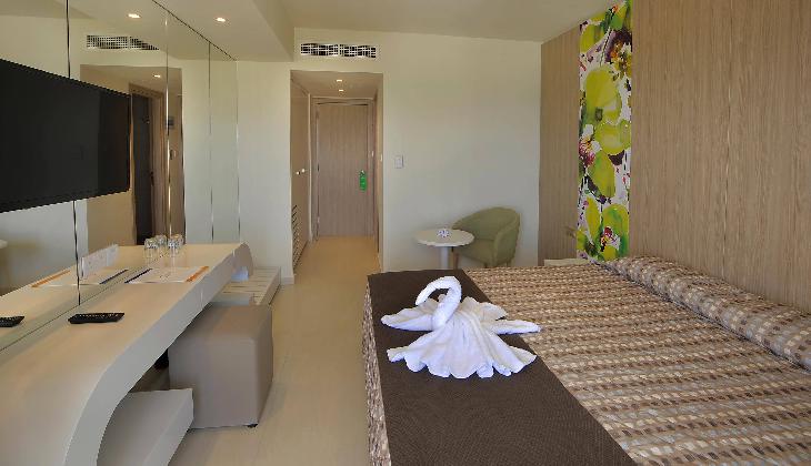 This hotel is located on a flat, sloping sandy beach, close to a romantic fishing port and just 10 minutes from the lively resort's centre. Shops, bars, nightclubs and restaurants as well as links to the transport network are located in the near vicinity.Built in 1992, this hotel is spread over 5 floors and comprises 93 double rooms. A lobby awaits you with 24-hour reception service, safes, a currency exchange counter and lifts. Facilities include a café, a kiosk, a mini supermarket, a cocktail bar with outdoor area, a games room, a TV room, an air conditioned à la carte restaurant with terrace (high chairs for infants provided), a conference room and a public internet terminal (at an extra charge). There are also room and laundry services, medical assistance, bicycle hire and a car park on offer.The comfortably furnished rooms come with an en suite bathroom with hairdryer, a direct dial telephone, satellite/cable TV, a radio, a minibar/ fridge (on request, at an extra charge), tiling, a hire safe, central heating and a balcony (with either part or full sea views).The beautiful outdoor complex offers a fresh water swimming pool with children's paddling area, a pool/ snack bar as well as sun loungers and parasols. Additionally, the hotel offers a sauna (for an additional fee), a gym and a massage service. Sports activities such as tennis (floodlit at an extra charge), table tennis and aerobics can be tried out. There is also a seasonal entertainment programme to provide some variation for guests.Guests are offered breakfast, lunch and evening meals in the form of a buffet and have the opportunity to book either a full board or an all-inclusive stay.