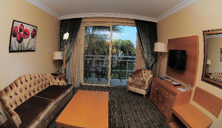 * Pool Side PANORAMIC JUNIOR SUITE ROOMS: 30, newly built panoramic Junior Suite rooms each one located on top of the Two bedroom Family rooms, all over looking to \"Y\" shaped large swimming pool and sea. Panoramic Junior Suite rooms have private open-air roof terrace with its own stable sitting group, umbrella, and sun beds just dedicated for special guests. En suite facilities, wc, shower, international direct telephone line, satellite LCD plasma TV, DVD player, safety deposit box, heat/cooling air-conditioning, hair dryer, electric kettle, mini bar, carpet & parquet flooring, pool view large balcony. Each Panoramic Jr. Suite room has one double bed and sofa available additionally. According to additional people sofa bed can be open as extra beds; each one about 50 m2 huge space which offers you special and private comfort.