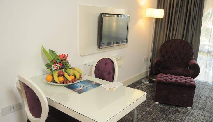 * HOTEL JUNIOR SUITE ROOMS:Main Hotel rooms: One bedroom with one living room there are 8 suite rooms 4 of them over looking to sea and rest of 4 rooms are over looking to land view. The Junior Suite rooms are located in second and top floor in the main hotel building. Each one newly decorated with high standard furnishing, 49.00 m2 space, superior comfort large rooms with queen size bed, private Jacuzzi/shower, en suite, large balcony, satellite plasma LCD screen TV, heat/cool air-conditioning, mini bar, hair dryer, safe box, carpet flooring, smoke detector, one bedroom and living room including working table.Each Junior Suite room\'s offer large space up to 3 people & those rooms are ideal for large families too.