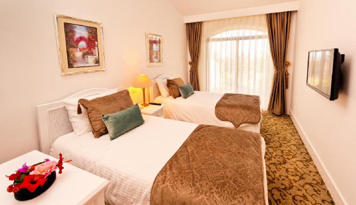 * The resort has 105 rooms. Direct dial phone, minibar, electronic safe, electronic door lock, room service, internet connection, satellite TV, air condition, hairdryer and make up mirror are available in the rooms.