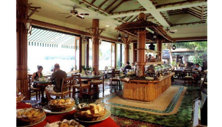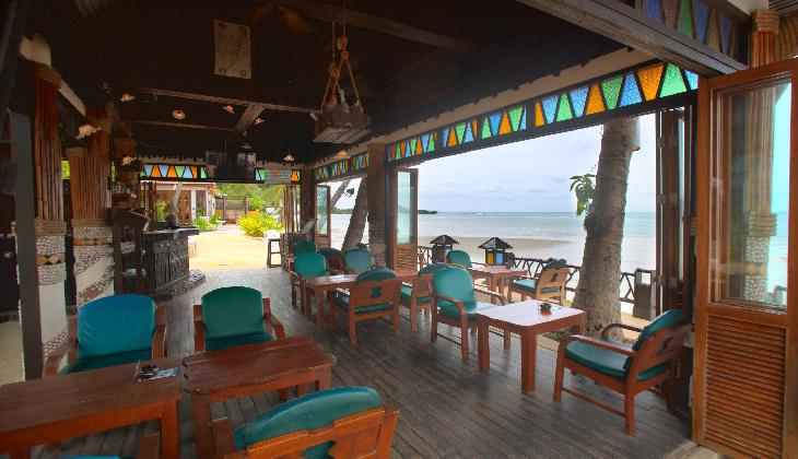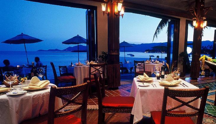 Colourful Mediterranean décor. High ceiling with wooden beams and ceiling fans. Open-air terrace with views of the ocean. Menu includes Thai curries, seafood, and International cuisine. Buffet breakfast and à la carte menu. Themed buffet nights during high season. Open from morning till midnight.