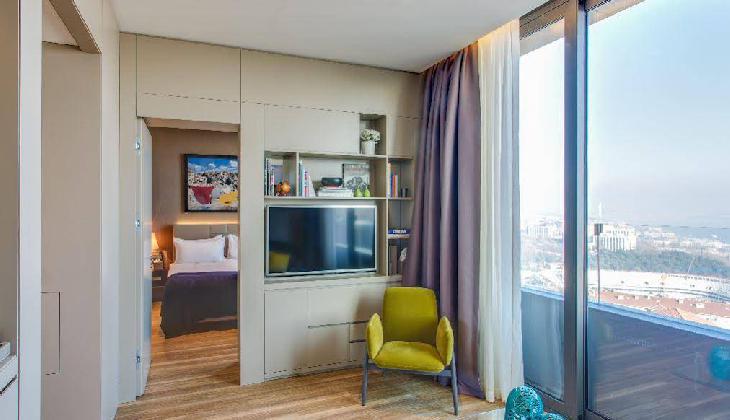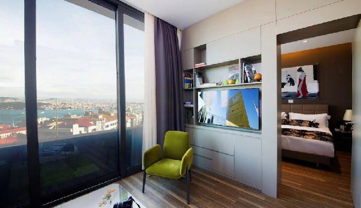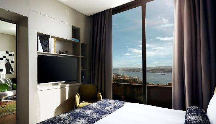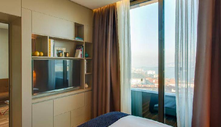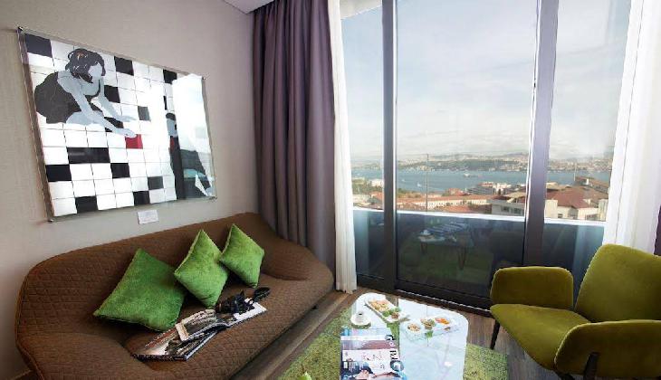 - سوئیت با منظره تنگه بسفر: 40 متر مربع مساحت دارد و شامل یک تخت خواب بزرگ دو نفره به همراه یک کاناپه تختخوابشو است. ظرفیت اتاق 3 نفر است اما امکان پذیرش یک نفر مهمان را دارد. پنجرههای بزرگ این سوئیت منظره پانارومیک زیبایی از دریا را به مسافران هدیه میدهد.