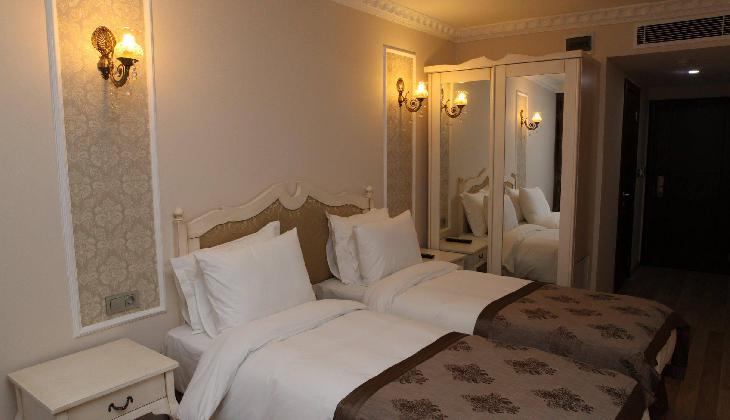 اتاق های دلوکس دابل هتل تراس 18 متری هستند. این مساحت اتاق تقریبا برای بیشتر هتل های منطقه تکسیم در همین حدود است. دکوراسیون اتاق ها به صورت کلاسیک تزیین شده و کمد ها و درها از جنس چوب قهوه ای تیره هستند.