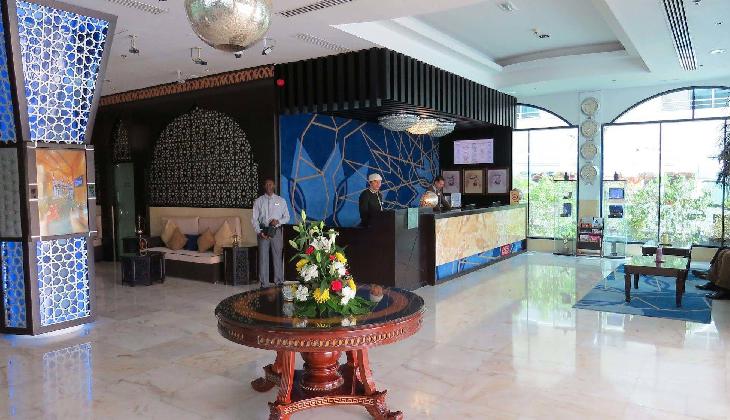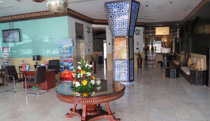 The medium-sized lobby is bright and elegantly decorated, with marble flooring and traditional furniture. The reception is found on the right of the entrance and adequate seating is available to arriving guests.