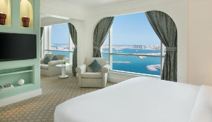 * Rooms overlook the Arabian Gulf or adjacent landscaped gardens and feature flatscreen cable TVs with DVD players, high-speed Internet connections, and minibars. Contemporary, marine-coloured bathrooms come with tubs, bathrobes, and designer toiletries.