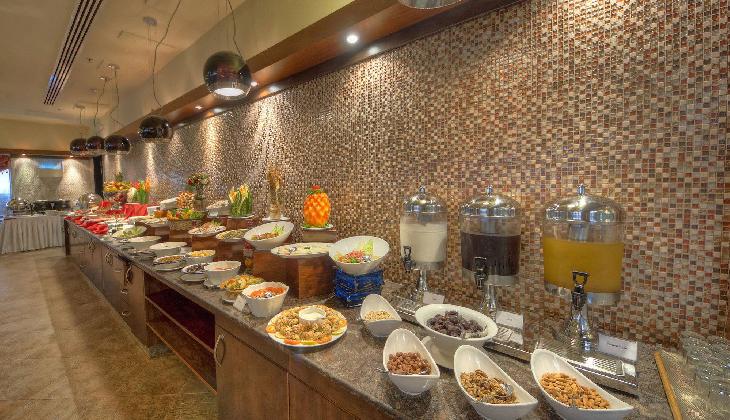 Mosaic Cafe opens from 06:00 PM to 02:00 AM serving quick snacks, sandwiches and cakes. It\'s an Ideal social gathering place for friends and families to enjoy the real taste of freshly Baked SAAJ.Marina\'s Pool Restaurant open for Lunch and Dinner Parties which can accommodate up to 200 people to celebrate their special events and enjoy the live and fresh BBQ items. An impressive and exclusive atmosphere will enhance your event prestigious. Marina View Hotel provides a truly Dining experience at your door step. The Hotel\'s Chefs are pleased to offer and serve you during your hosted parties at home or any where you think of. Marina view Hotel\'s team of experts can make it happen at all times.Room Service menu is served around the clock.Marina View Hotel\'s Pastry Shop is ready to get your cake orders and special cakes can be made availing 24 hours notice.