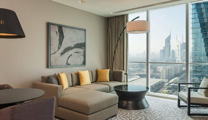 Property Location A stay at Sheraton Grand Hotel, Dubai places you in the heart of Dubai, convenient to Dubai International Convention and Exhibition Centre and Dubai Mall. This hotel is within close proximity of Zabeel Park and Dubai International Financial Centre.Rooms Stay in one of 654 guestrooms featuring LCD televisions. Complimentary wireless Internet access keeps you connected, and cable programming is available for your entertainment. Bathrooms feature separate bathtubs and showers, complimentary toiletries, and hair dryers. Conveniences include safes and coffee/tea makers, and you can also request cribs/infant beds.Rec, Spa, Premium Amenities Take time to pamper yourself with a visit to the full-service spa. If you're looking for recreational opportunities, you'll find an indoor pool and a fitness center. Additional features include complimentary wireless Internet access, concierge services, and tour/ticket assistance.Dining Satisfy your appetite at the hotel's restaurant, which serves breakfast, lunch, and dinner. Dining is also available at a coffee shop/cafe, and 24-hour room service is provided. Quench your thirst with your favorite drink at a bar/lounge.Business, Other Amenities Featured amenities include a business center, luggage storage, and coffee/tea in the lobby. Planning an event in Dubai? This hotel has facilities measuring 10007 square feet 930 square meters, including meeting rooms. Free valet parking is available onsite.